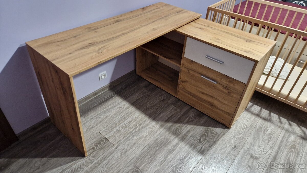 Prodám pracovní stůl. 5 let starý. 2 malé oděrky. Rozměry: výška 72 cm, šířka stolu 50 cm, skříňky 40 cm, délka stolu 138 cm, skříně 117 cm. Osobní odběr v Plzni