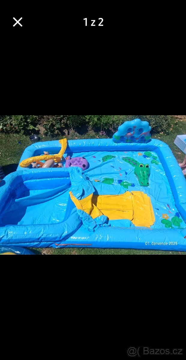 Dětský mělký bazének. Nepoužitý, nerozbalený (máme dva stejné). Nosnost: 81 kg Výšky stěny malého bazénku: 11 cm, 57l Výšky stěny většího bazénku: 20 cm, 493 l Rozměry: 257 x 207 x 84 cm Více viz https://1url.cz/8Jph9