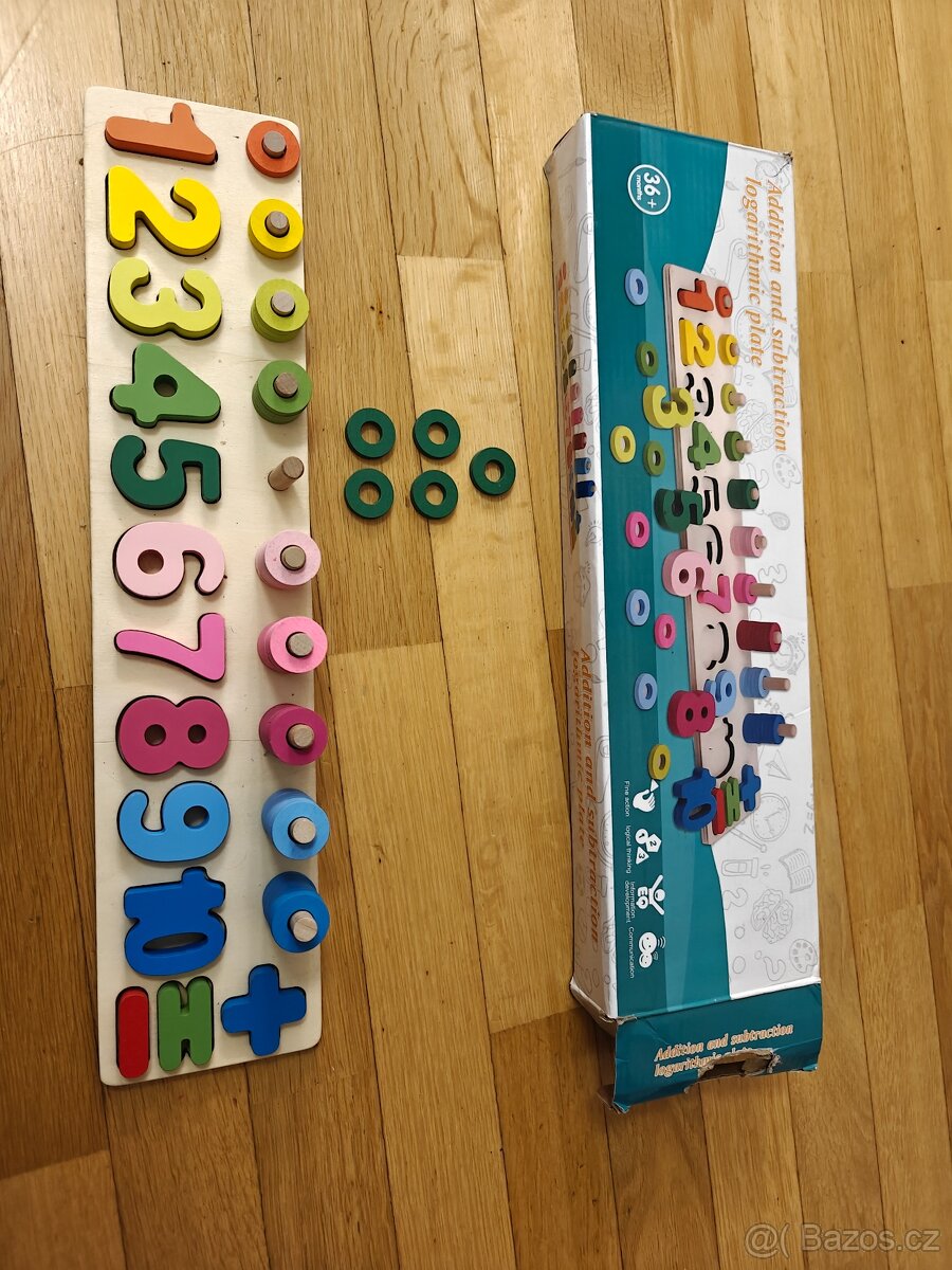 Dřevěná edukační hra s čísly. Seřaď kolíky podle velikosti a přiřaď podle vloženého čísla barevné kroužky. Pro menší děti trénink barev. U desítky chybí jedno modré kolečko jinak kompletní. Nahradili jsme plastovým. Prosím ne sms
