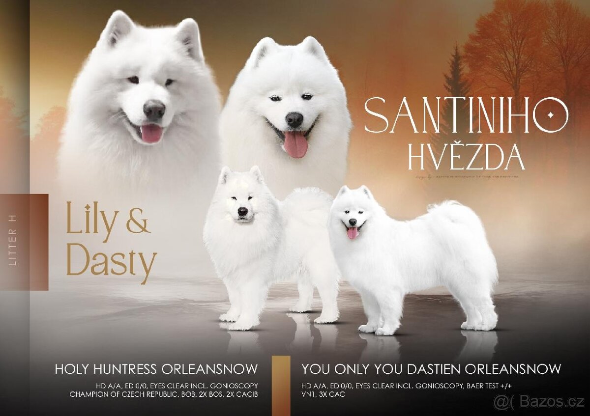 Cena: Dohodou. Po zrušené rezervaci ze zdravotních důvodu nabízím k prodeji štěňátko samojeda - pejsek, který se narodil 24.11. 2025. Oba rodiče mají zdravotní vyšetření s negativním výsledkem, DKK A/A, provedeno oční vyšetření včetně gonio. Štěňátka odchovaná v naší CHS mají přátelskou povahu typickou pro plemeno samojed o čemž se můžete přesvědčit sami u nás ve Svratce. Každému zájemci o štěňátko z naší CHS nabízíme nezávaznou návštěvu u nás ve Svratce. Samojedi miluji svoji člověčí smečku, toulky přírodou, dlouhé procházky. Nezkazí žádnou legraci. Štěňátko z naší CHS odchází čipované, očkované s EURO pasem, PP dle FCI. Pokud Vás zajímají bližší informace neváhejte napsat, zavolat.