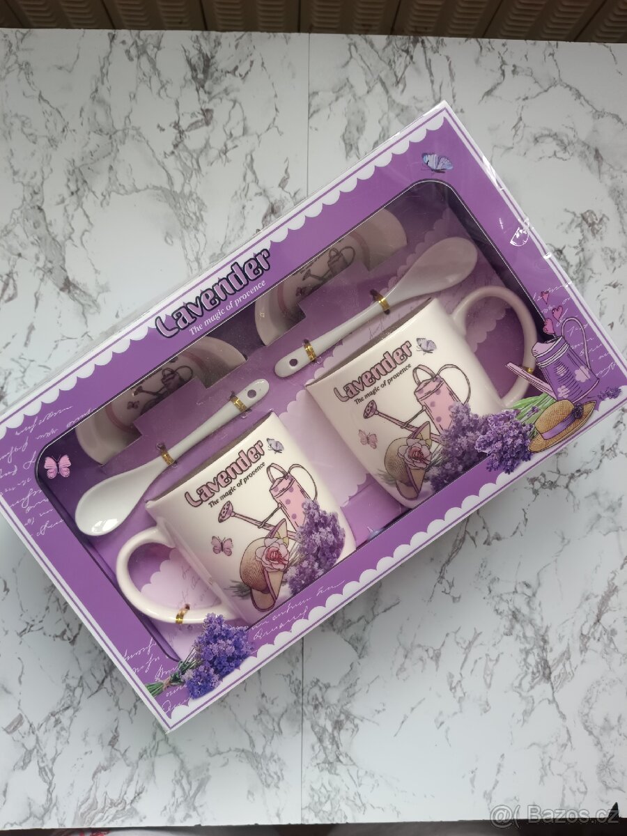 Levandulový set nádobí. 2x hrneček (objem 300 ml), 2x lžička, 2x podšálek. Krabice už byla otevřená k nahlédnutí, vše nové, nepoužité. Posílám dostatečně zabezpečené proti rozbití.