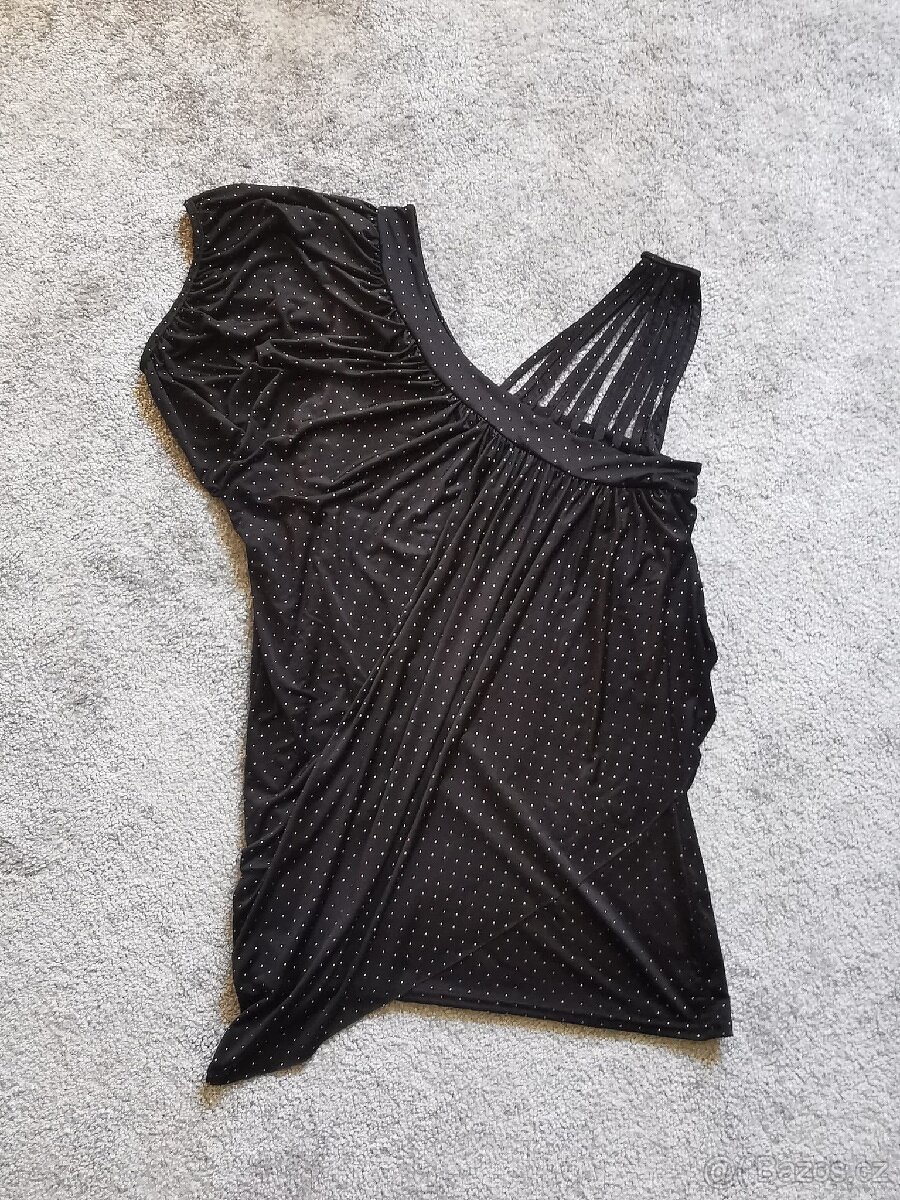 Společenská halenka, uvnitř je elastické tričko a přes něho je volnější látka. Asymetrické, černé se zlatým puntíkem. 1x oblečené. Vel. 14 (42). Šířka 41cm, délka 70cm.