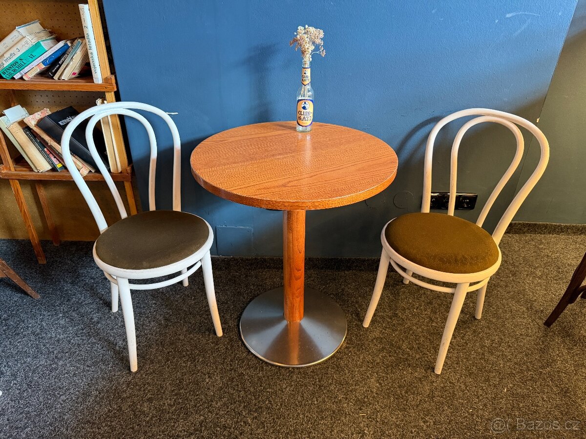 1 x kulatý kavárenský retro stůl 790,-/ ks 2 x židle 490,-/ks Cena za set 1290,- Stůl 65 x 65 x 75 cm (D x Š x V) Mám celkem 60 různých židlí a 20 stolů a 10 barových židlí TON Prodávám i další nábytek a gastro vybavení, podívejte se na mé inzeráty. Vybavení kavárny, nábytek do kavárny, kavárenský stůl, židle ton, gastro vybavení, retro židle.
