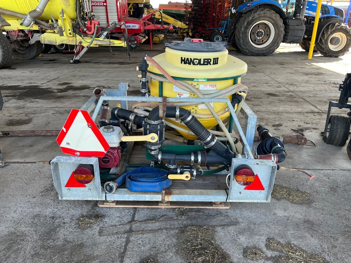 Cena: Dohodou. Prodám profesionální míchací a plnící jednotku The Handler – Handler III H33 (3”) s benzínovým motorem Honda a odstředivým čerpadlem. Objem cca 275 l, 3” potrubí + Camlock připojení, venturi systém pro nasávání chemie z kanystrů i externí nádrže. Vhodné pro rychlé plnění postřikovače a míchání. Samostatně poháněná jednotka – není potřeba hydraulika z traktoru. Stav výborný.