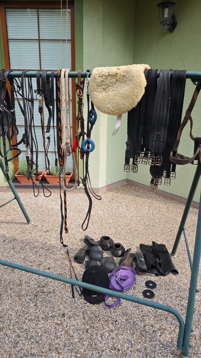 Cena: V textu. Thiedemann komplet 450,- Kč (PRODÁNO) Kožený vyšívaný podbřišník délka 128 cm 850,- Kč Kožený chanbon s kovovou karabinou 400,- Kč (PRODÁNO) Gumový chambon (gumičky) s kovovou karabinou 180,- Kč Vyvazovací otěže s gumovým kolečkem nové 600,- Kč Ohlávka kožená, velikost nastavitelná 200,- Kč Ohlávka zelená velikost 2 funkční. Opraven středový kovový kroužek 100,- kč Štajgr komplet 400,- Kč (PRODÁNO) Bezudidlová provazová uzdečka velikost COB 300,- Kč Vodítko černé 100,- Kč Vodítko s panic karabinou 150,- Kč Vodítko pracovní s BULL karabinou 300,- Kč kožený konec trochu poškozen, Dá se vyměnit. (PRODÁNO) Jezdecký bičík kus 50,- Kč Podbřišník 1x 110cm 200,-Kč (PRODÁNO) Podbřišník 1x 120 cm 100,- Kč Podbřišník 2x130cm 200,- Kč Pravý beránek na anglické sedlo 800,- Kč Jezdecká čepice Casco velikost 54-57cm 700,- Kč Jezdecké chapsy Kentaur velikost S 700,- Kč Brašna cestovní za nebo před sedlo univerzální 800,- Kč Kamaše přední COB 150,- Kč (PRODÁNO) Kamaše přední pony 150,- Kč (PRODÁNO) Zv