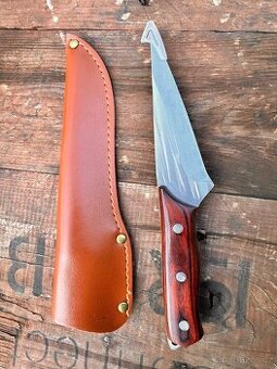 Prodám hezký vzhledově kovaný nůž který má hezký styl čepele. Je to nůž na maso na grilování, do lesa, ale i do kuchyně. Specifikace: celková délka 27,6cm čepel 14,7cm rukojeť 12,5cm.