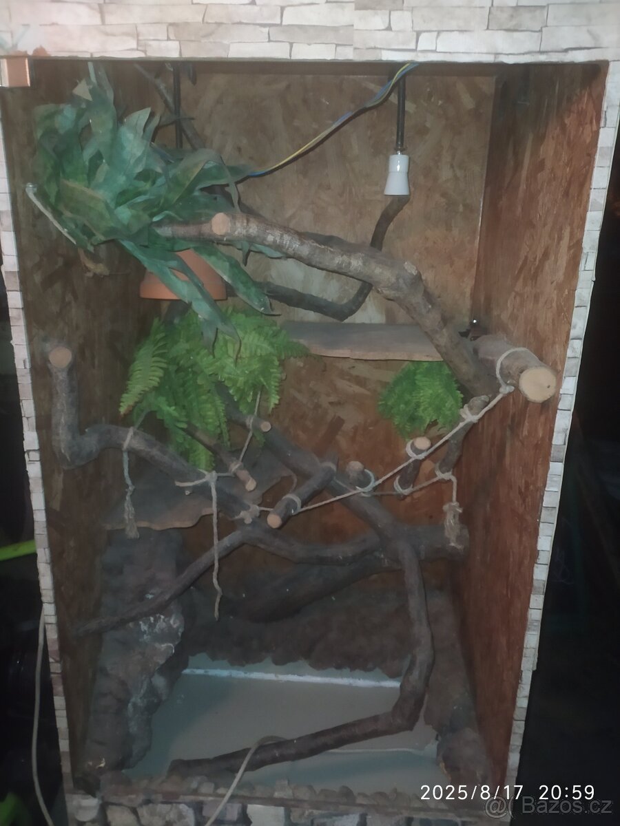 Terárium situované na výšku z OSB.Už je starší ale myslím že stojí za trochu péče a bude ještě dobře sloužit.Je tam i vodopád, dole je vana s výpustí ale kolem výpusti prokapává.Chybí přední sklo které se vsazuje (nevrtá) proto nízká cena. Vhodné pro chameleona, mladého leguána, stromové středně velké hady a pod.