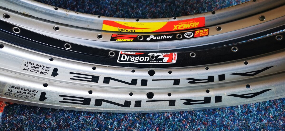 Nové ráfky na kolo 26, 2 kusy Vuelta Airline 1 36 děr. 1 kus Remerx Dragon černý, 32 děr. 1 kus 28, Remerx Panther, 36 děr. 1 kus Remerx Tornádo, 36 děr. Mírně jetý. Cena za všechny, třeba to někdo využije.