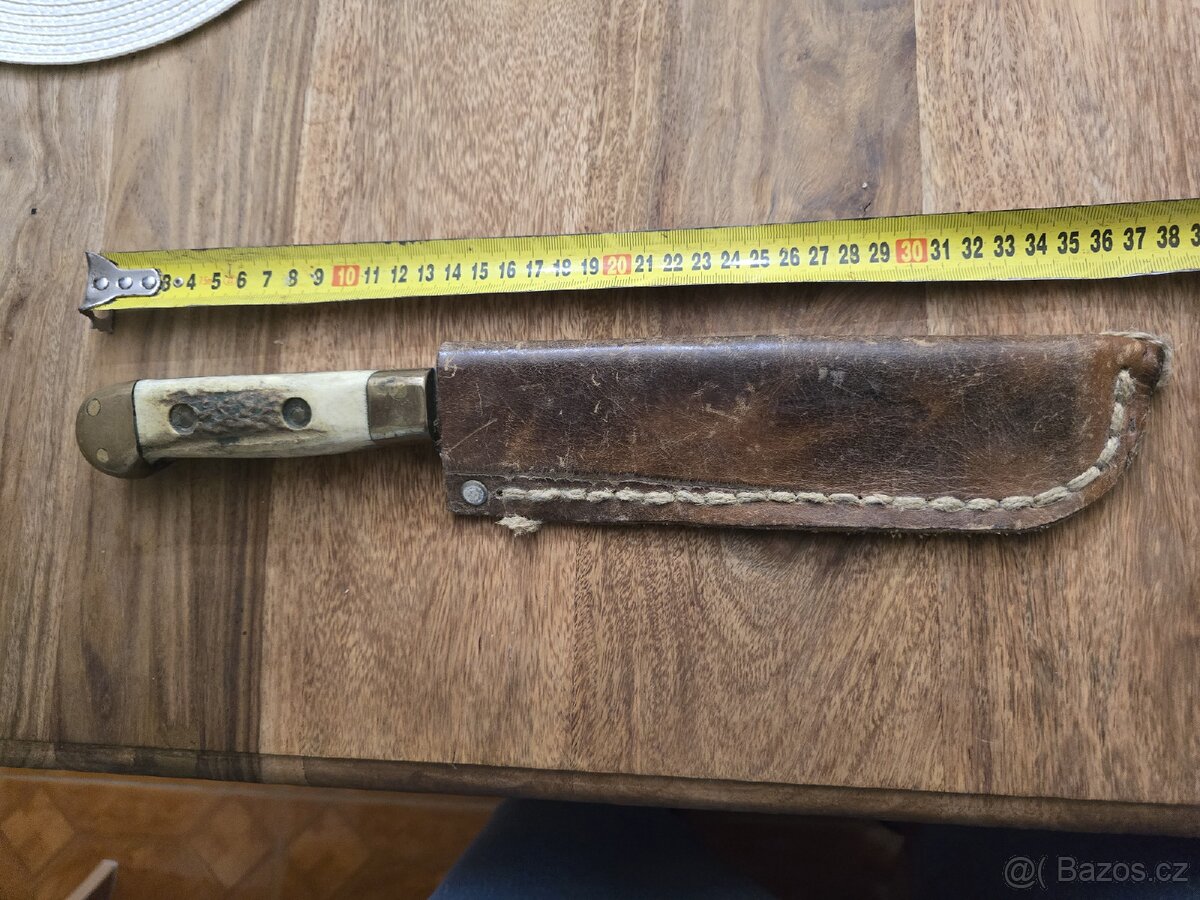 Velky starý lovecký tesák. Jednostranně broušená těžká čepel klínovitého průřezu, rukojeť v mosazné montáži, střenky rukojeti z parohu. Kožené pouzdro. Střední Evropa kolem 1900, délka 35 cm.Velice masivní provedení Viz. Fota. KOUKNĚTE NA MÉ DALŠÍ NABÍDKY.