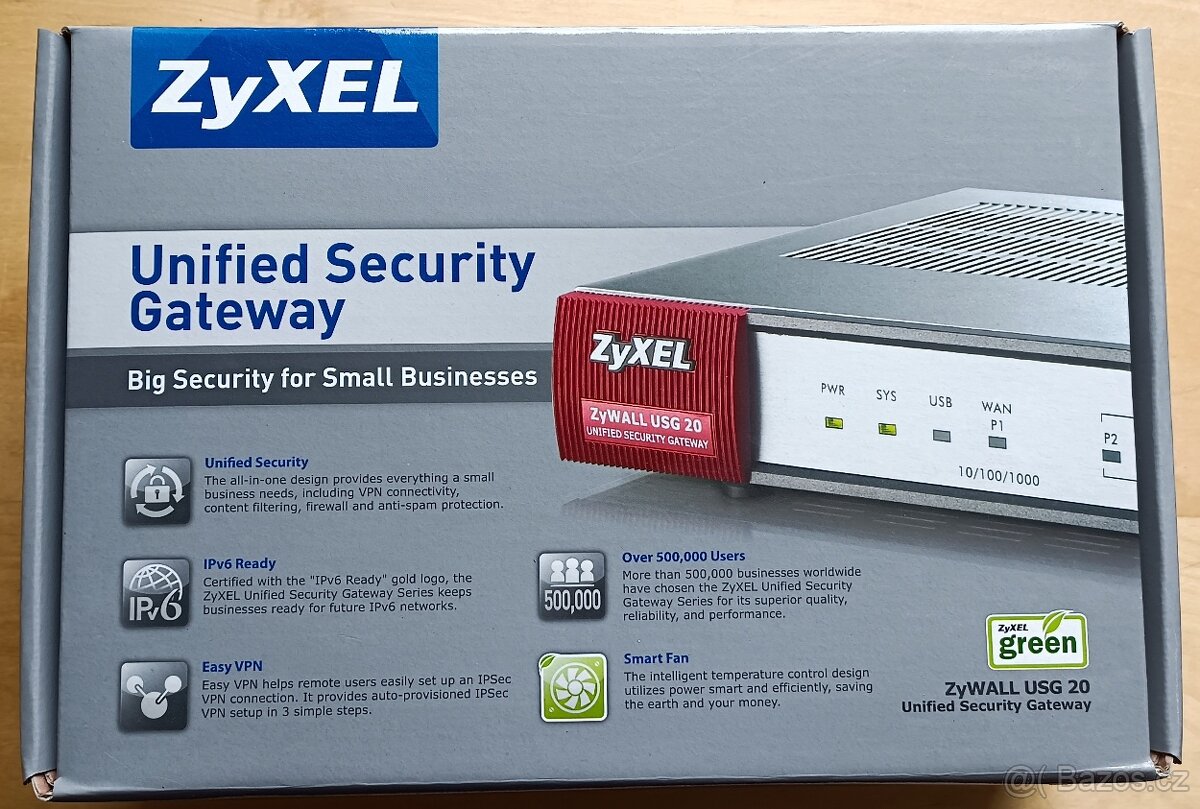 Prodám funkční firewall ZyXEL ZyWALL USG 20 v originální krabici. Unifikovaná bezpečnostní brána (USG) ZyWALL USG 20 je třetí generací zařízení ZyWALL a je postavena na zcela nové platformě. ZyWALL USG 20 zajišťuje hloubkovou kontrolu paketů pro malé organizace i domácnosti a díky nové platformě je i rychlejší. Zařízení nabízí stavový firewall (SPI), obsahový filtr, Antispam a VPN (IPSec/SSL). Tato sestava vícevrstevného zabezpečení chrání záznamy organizace, duševní majetek a kritické zdroje před vnitřními i vnějšími hrozbami. ZyWALL USG 20 umožňuje postavit bezpečnou síťovou infrastrukturu a chránit tak cenná data. Zajišťuje chráněnou expanzi organizace na vzdálená místa a také možnost práce z domova. V dnešní době jsou podnikové sítě neustála bombardovány nevyžádanou poštou (spamem). Brána poskytne inteligentní detekci spamu a jeho proaktivní blokování. Uživatelé tak nejsou zavaleni zbytečnou prací při třídění své pošty, která vede ke ztrátě produktivity. Unifikovaná bezpečnostní