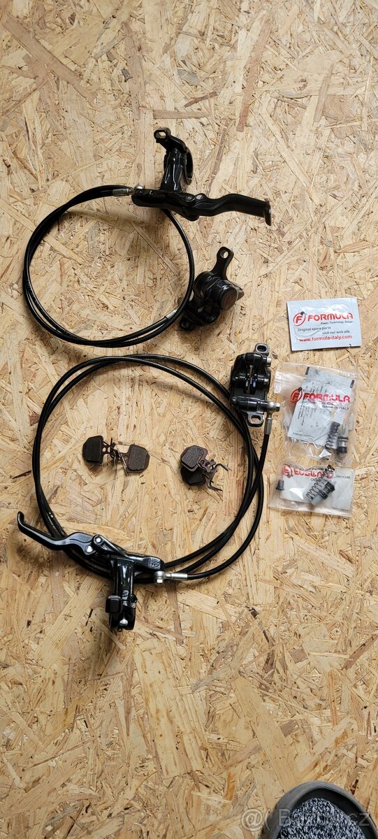 Prodám kapalinové brzdy Formula Oro na repas, nebo na díly. Původně na kole Canyon Nerve XC. Délka hadic 860 mm předek, 1510 mm zadek. Náhradní platničky a díly pístku v ceně. Úklid garáže, je mi líto je vyhodit. Prosím jen volat, na zprávy neodpovídám. Děkuji.