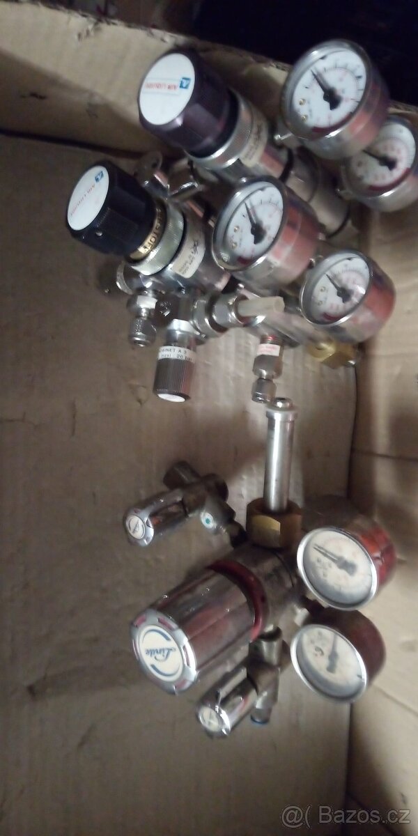 Cena: Dohodou. Redukční ventily technických plynů, dusík, kyslík, hélium k technologii laser. Plně funkční.