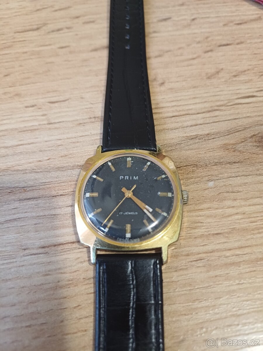 Cena: Dohodou. Prodám elegantní pánské mechanické hodinky značky PRIM. Klasický vintage model s černým ciferníkem a zlatým pouzdrem. značka: PRIM mechanický strojek (17 Jewels) černý ciferník se zlatými indexy zlaté pouzdro černý kožený řemínek (novější) ruční nátah Hodinky jsou v pěkném vizuálním stavu vzhledem ke stáří (viz foto). Skvělé jako doplněk k obleku nebo pro sběratele retro kousků.