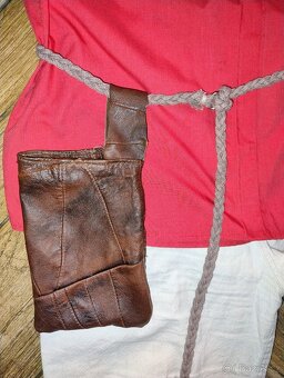 Len a bavlna, kožený sáček na pleteném opasku. Nepoužité, bezva stav, ručně šité. Červená halena šíře prsa 60cm, délka 74cm. Univerzální velikost až na XL. Kalhoty pas 46 cm, délka 106cm. Univerzální velikost S-XL, vše se stahuje kalounem a páskem. Dobový kostým na L- XXL. Bílá bavlněná halena přes hlavu, š70, d 80cm. Nepoužité. Šedé široké kalhoty, délka 106cm, kožený široký pásek 112 cm a kožená kapsa, sáček na opasek ( vejde se tam mobil) vše čisté a v pořádku, ručně přešito. Cena za jeden kostým!