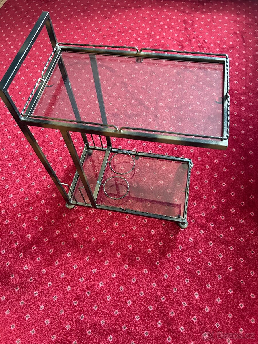 Prodám kovový barový stolek s kolečky se skleněnými výplněmi. Domácí hand-made výroba.
