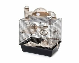 určena hlavně pro křečky velikost 42×28×38 cm černá klec, barva příslušenství - modrá, béžová, zelená, růžová kolotoč, domeček, terasa, miska a labyrint rozteč drátů: 0,9 cm, počet dvířek: 2