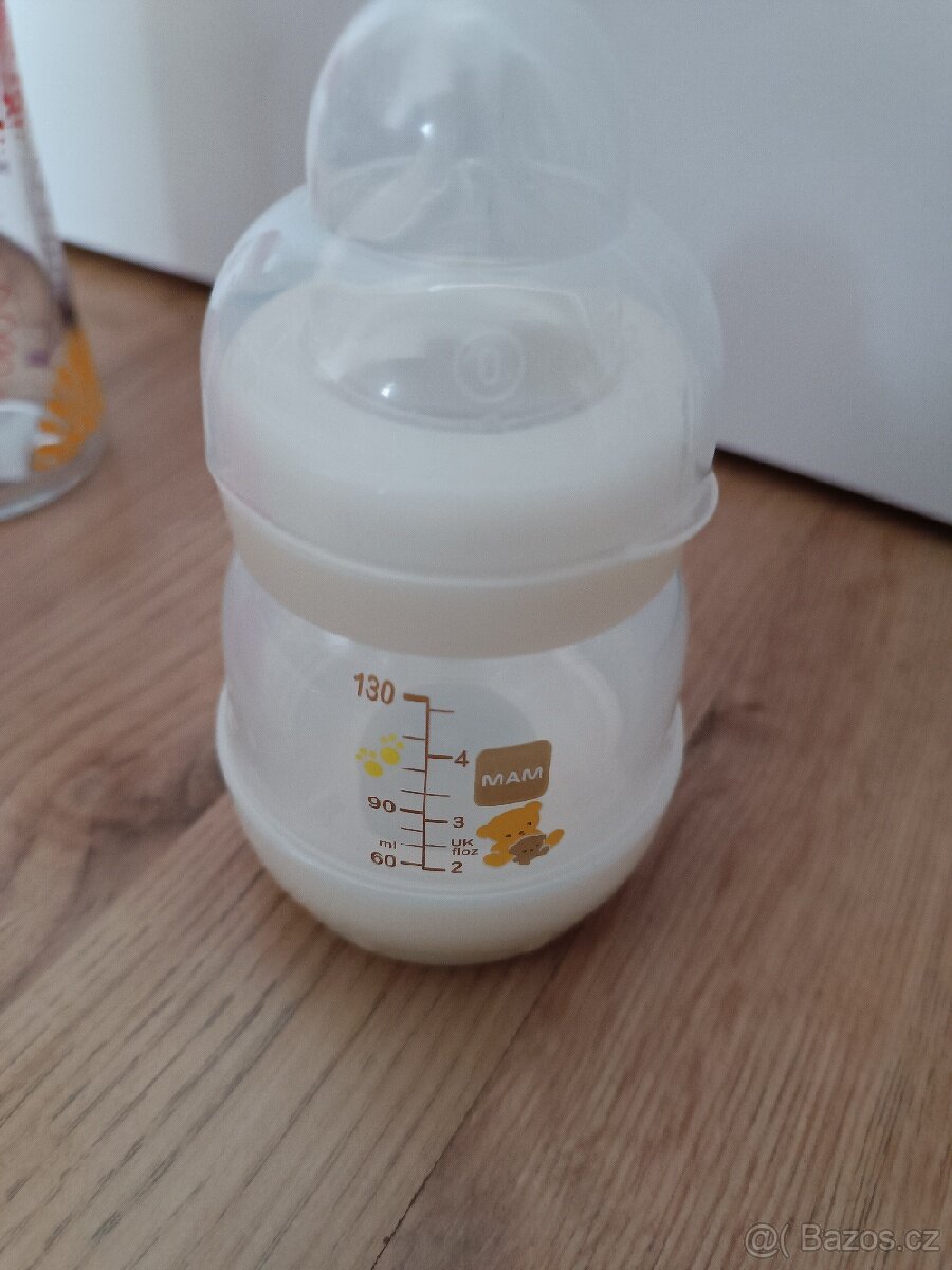3 nové nepoužité kojenecké lahve plus jedna plastová použitá zdarma při koupi všech najednou. Cena celkem 100,-Kč
