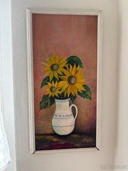 Prodám ručně malovaný obraz se slunečnicemi ve váze, zarámovaný v bílém dřevěném rámu. Hezká dekorace do bytu, kuchyně nebo na chalupu. Stav velmi dobrý, připraven k zavěšení.
