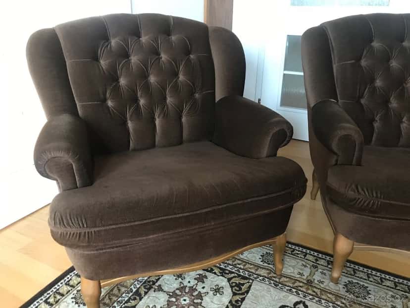 2 ks křesla nadčasový elegantní doplněk interiéru, málo používaný, ve velmi dobrém stavu, sametové čalounění v odstínu kávy, dřevěný masiv, velmi pohodlná, lehká konstrukce, dají se snadno přenést, skladná - hodí se i do menšího interiéru. Jsme nekuřáci a nemáme žádná zvířata (pes, kočka,...), 3800,- Kč/1 ks.
