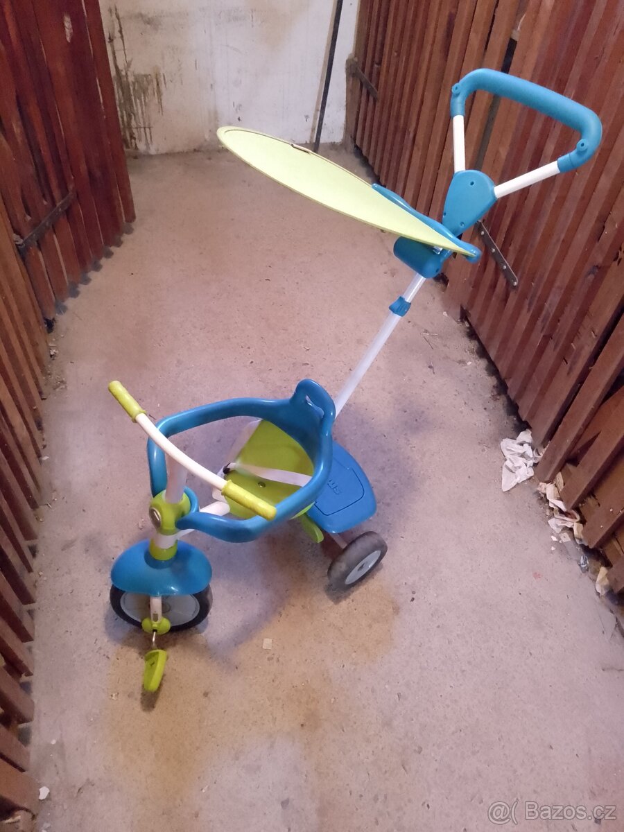 Cena: Nerozhoduje. Multifunkční tříkolka SMARTRIKE. Přizpůsobení podle velikosti dítěte, lze tlačit, držátko posléze odejmout a použít jako odrážedlo, šlapadlo, tříkolku. Zábrana a pásy pro nejmenší děti, posléze lze také odejmout, UV slunečník, úložný prostor vzadu.