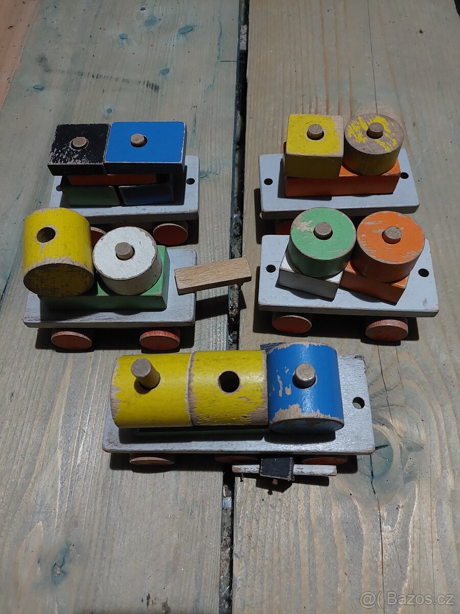 Cena: Dohodou. Prodám starý dřevěný vláček, počítadlo a plechovou hračku - fotbalisti.