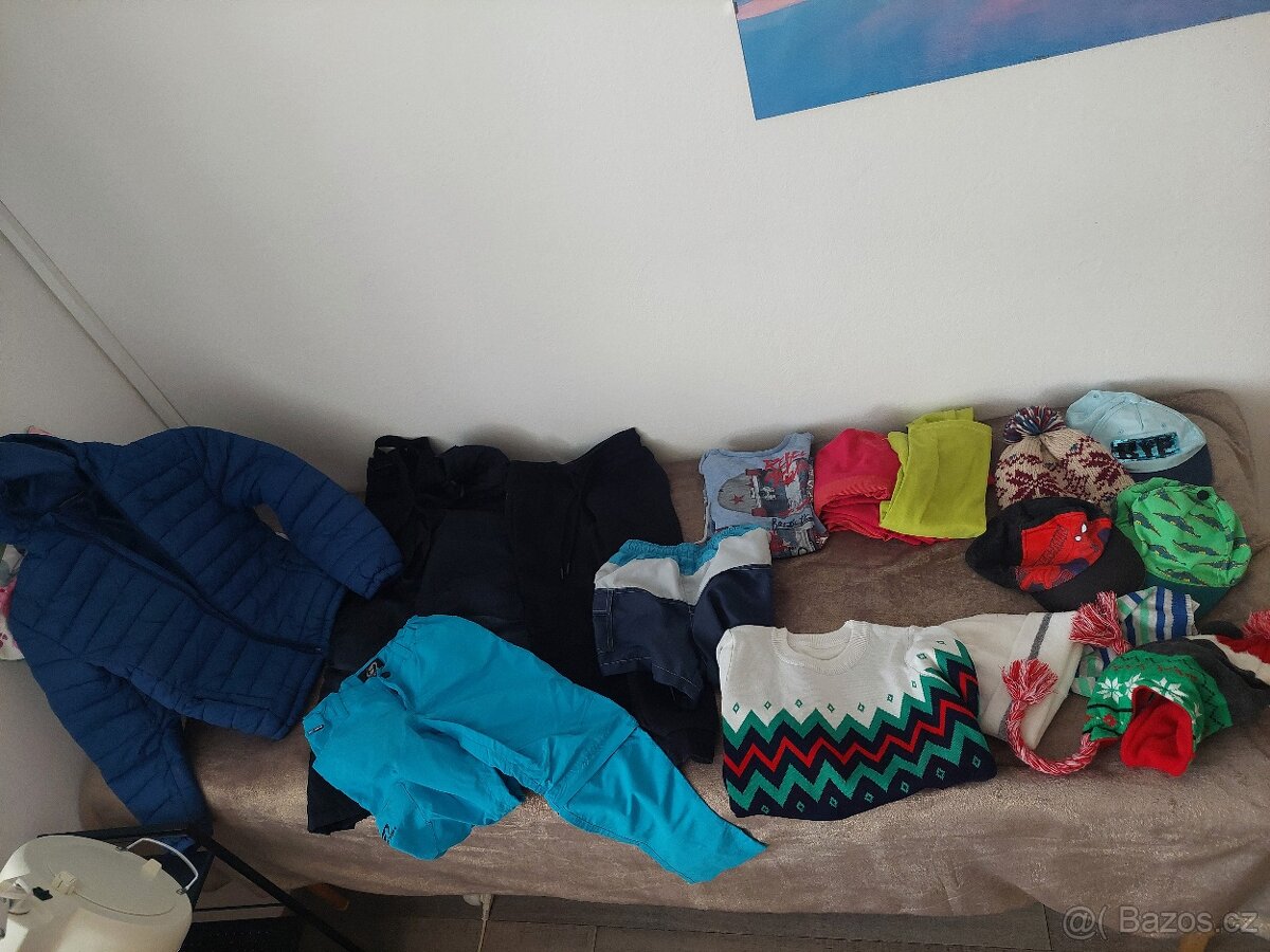 Balíček oblečení 128-140 Bunda vel.140 nejde rozepnout zip. Oteplováky v.122/128, tepláky v.146, plavky volně v.128, svetr v.134