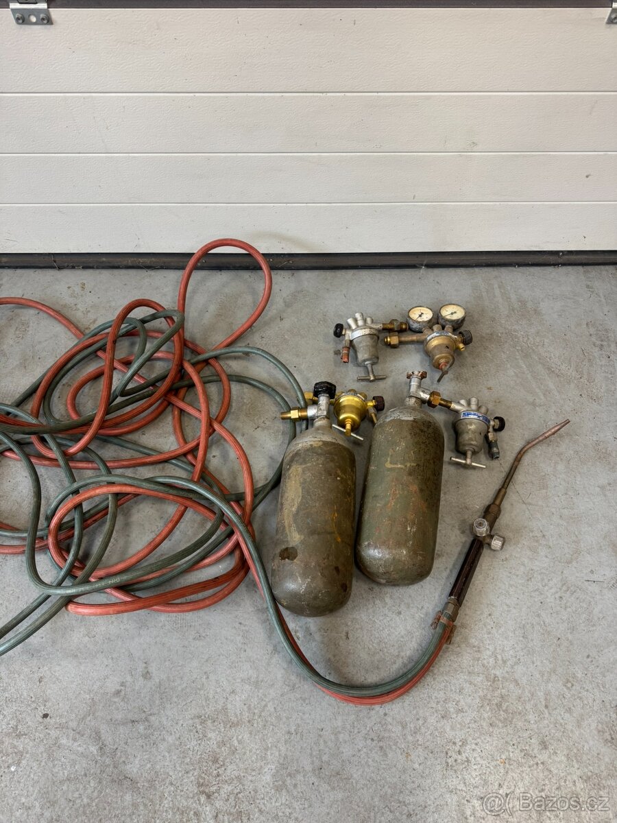 Autogenní souprava viz foto. Dvě lahve, hodiny, hadice, hořák, přepouštěcí trubka s manometrem