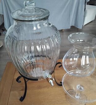 Cena: Dohodou. Sada 4 ks váz možnost využití k aranžování. 1 ks skleněná nádoba s kohoutkem. Vše je z tvrzeného skla. Cena dohodou.