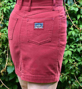 Džínová vínová sukně H.I.S., krátký zip, 1x druk, 2x přední kapsa, 2x zadní kapsa,vzadu malý rozparek. Pas 2x37cm.Džínová sukně je univerzálním základem šatníku hlavně na léto.Bílá sukně Quickstep,pas72,délka58cm,100%bavlna,Vel.S.