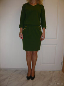 Nabízím nenošené šaty, barva mechově zelená, sportovní elegance. Délka od ramene dolů 104 cm, šaty se nosí trochu podkáslé, přes prsa 2x51cm, je to volný střih, pás 2x39cm.Podívejte se další mé inzeráty, ušetříte na poštovném.
