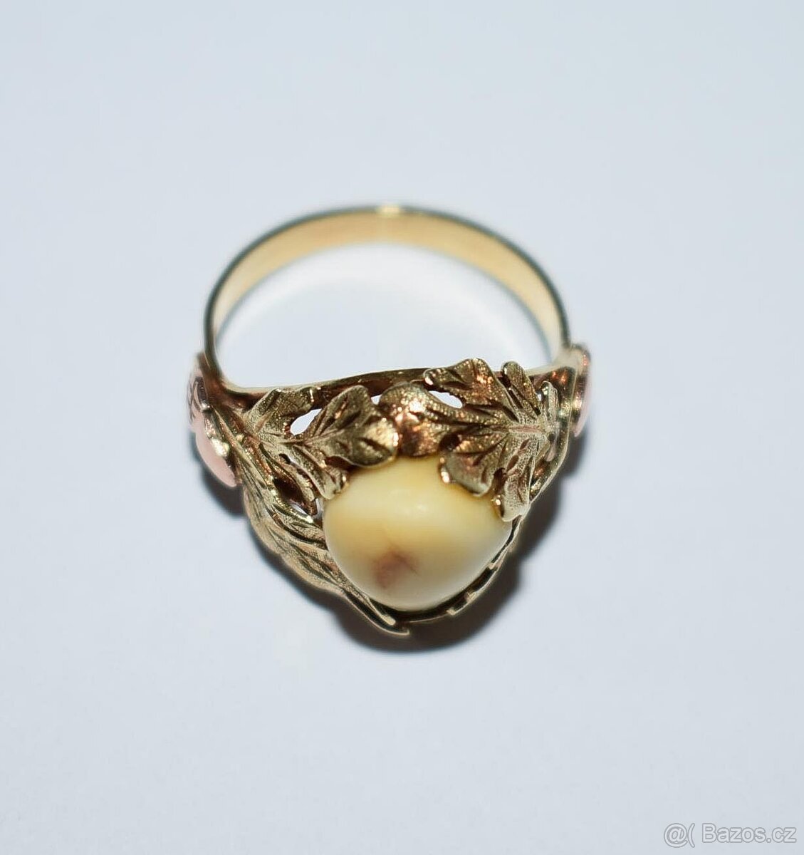 Masivní zlatý prsten (14 karátů, AU 585/1000) se zubem laně nebo jelena (grandle) vyrobený v 60.letech na zakázku.