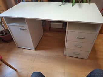 Bílý pracovní stůl, dětský stůl, kancelářský stůl vhodný do dětského pokoje nebo do pracovny nebo kanceláře. Rozměr desky 138x67,5 cm. Jedná se o stůl z dívčího pokoje. Šuplíky mají dno lehce znečištěné od dětského slizu a jiných kravin. Bílé sololitové dno se dá krásně vyměnit. Ke stolu přidám i pohodlnou kancelářskou polohovací židli na kolečkách. Původní cena všeho cca 6500 Kč. Mrkněte i na moje další inzeráty. Třeba se bude něco hodit.