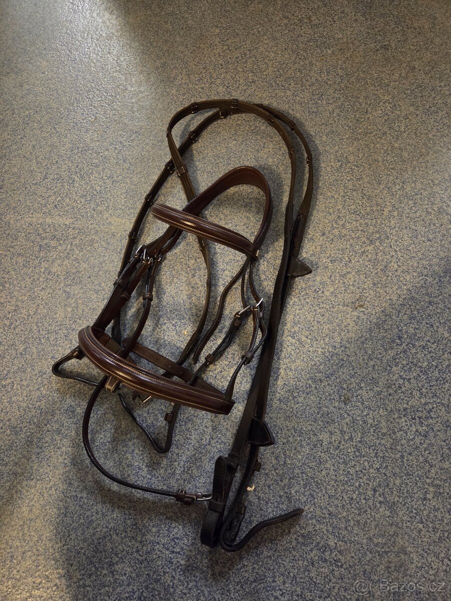 Cena: V textu. Krásná uzdečka Equipe a otěže . Uzdečka velikost cob hnědá kupovala jsem ji na mladého jen z ni vyrostl tak mu je malá na hlavě tak 5x . Měkká příjemná. Bohužel jsem potratila někde podpinku. Původní cena 8300 za uzdečku .Otěže Dyon používané vice pořád pěkné cena 1890 . Ted necham komplet za 2500.