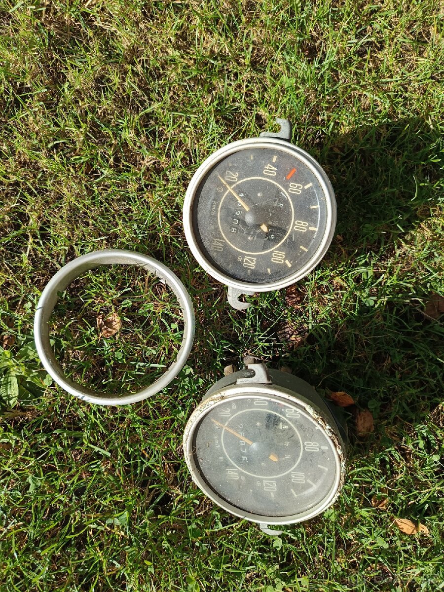 Prodam Tachometry na VW Brouk Prodám sadu tachometrů na veterána VW Brouk. Nálezový stav z vyklízení, ideální na renovaci Stav: Původní, nečištěno, nálezový stav (viz foto). Funkčnost nezkoušena. Cena: 1 800 Kč za vše (při rychlém jednání dohoda). Osobní odběr