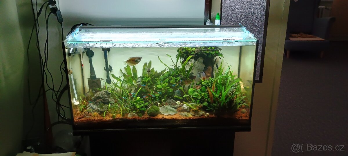 Prodám akvarijní set Aquael 112l.Externí filtr JK Atman 800.Topítko 100W.Světlo v krytu originál nebo světlo Sinkor II led a krycí skla.Filtr je tichý.Starší stolek pod akvarium k tomu.Osobní odvoz.Tel.605581024