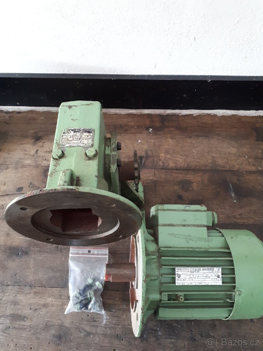Třífázový elektromotor s převodovkou. Motor se otočí 60x a ozubené kolo jednou.