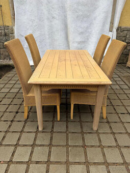 Prodám světle hnědý dřevěný stůl, rozměry 88 x 160 cm, výška 75 cm. Možné koupit v sadě se čtyřmi židlemi z přírodního ratanu zn. Lloyd Loom, pak cena po dohodě.