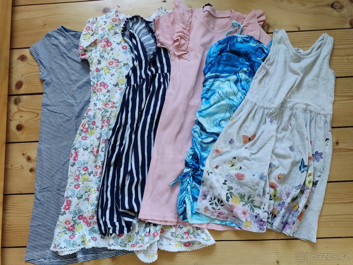 Dívčí šaty: pruhované z tkaniny - vzadu na knoflíky, velikost 134, cena 40kč. Kytičkované - velikost 134/140 cena 40 kč Pruhované z úpletu - velikost 146 je možné je nosit i dřív. Jsou více nošené, cena 10 kč. Starorůžové - velikost neudaná, proto prosím měřte. No šaty jsou elastické, pružné na postavu, cca od 128-134, u nás nošeny i jako 140, ale naše holka je hubená a drobnější. Cena 50 kč. Modré "mrakaté" - elastické, na boku ztažené gumičkou, co dělá hezký detail, velikost 8-9let, jsou také pružné, cena 30 kč. S motýlkama - velikost 122-128. Rozměry viz. foto, více nošené cena 20 kč