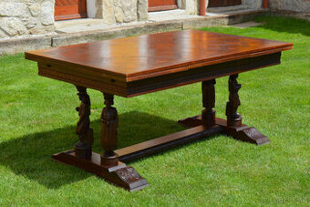 Starožitný vyřezávaný rozkládací stůl s figurkami