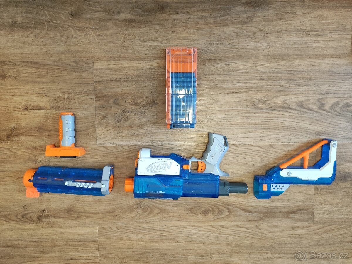 Dlouhá útočná puška nerf v průhledně modrém zbarvení které se jen tak nevidí. Zbraň funguje na zásobníkovým mechanismus který umožňuje rychlejší palbu bez potřeby neustálého přebíjení. Je v dobrém stavu a určitě se bude vyjímat na bojišti. Ke zbrani: pažba, hlaveň, rukojeť pro přesnější palbu, průhledný zásobník na kontrolu vašich nábojů a 12 nábojů do něj. Platba převodem a možnost odeslání.