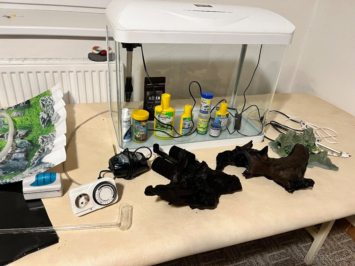 Prodám Kompletní akvárium. Obsahu je veškeré potrebne prislusenstvi pro jeho provoz. Ideální na chov krevet a malých rybek. Osobní předání Vrbno pod Pradědem