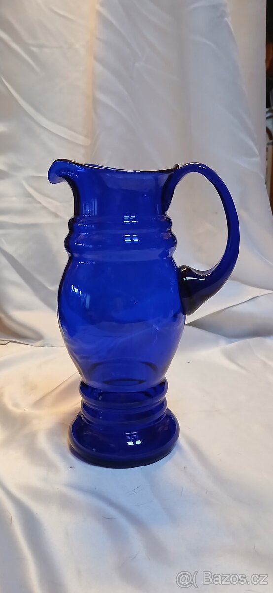 Ručně foukané kobaltové sklo.Džbán má charakteristicky tvarované tělo s prstencovými detaily na hrdle a patce a masivní natavené ucho.Výška 27cm, průměr hrdla 10/12cm