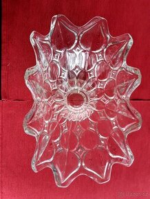 Prodám skleňenou starožitnou mísu s lipovými květy. Výška 19 cm, šíře 33 cm, hloubka 18 cm.