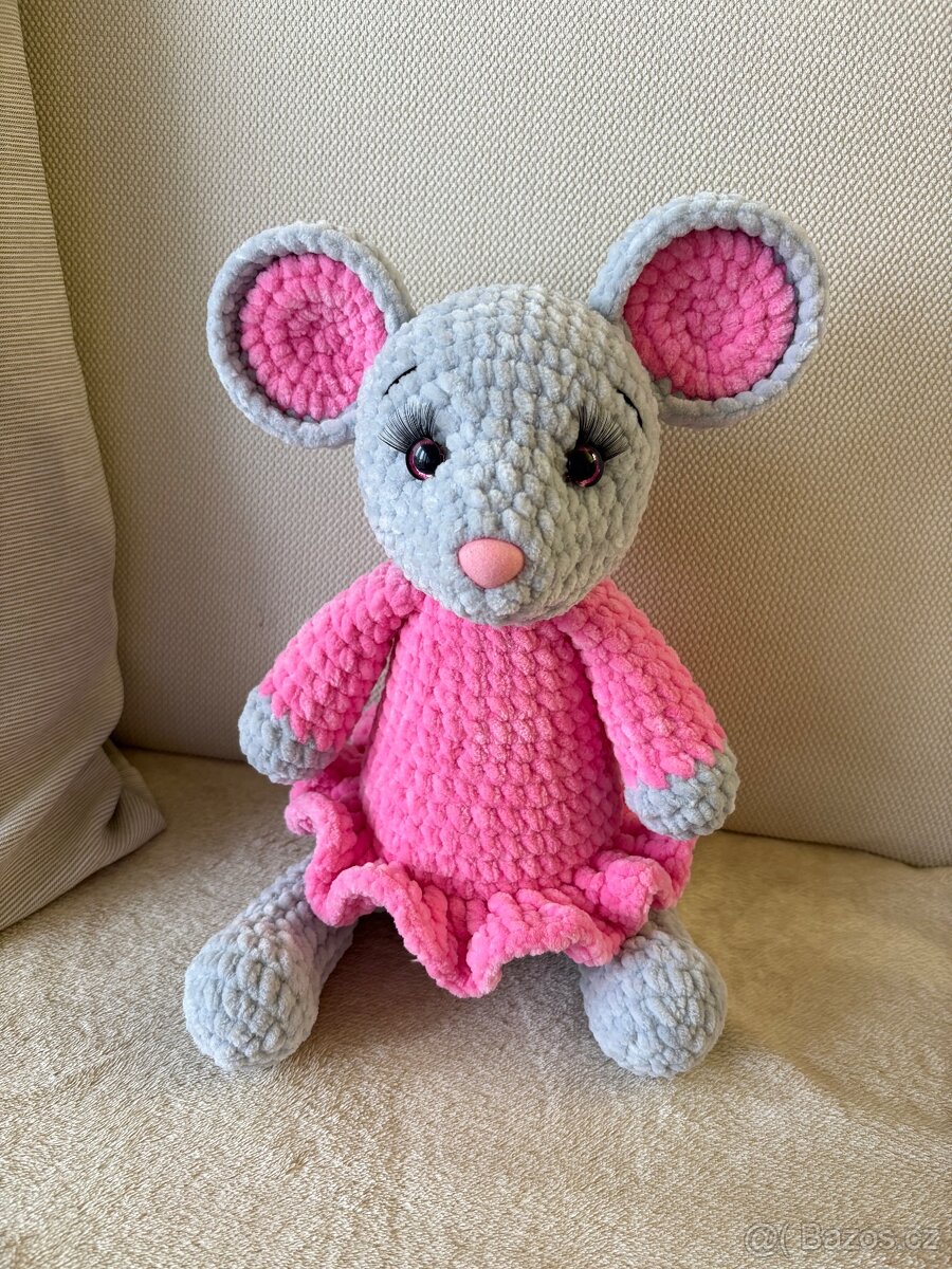 Ručně háčkovaná myška Julinka, vyrostla do výšky cca 33 cm, háčkovaná přízí Himalay Dolhin Baby (plyšové nitě, příjemné na dotek), bezpečnostní oči s řasami i bezp. čumáček, plněno dut. kuličkovým vláknem, pouze šetrné ruční praní na 30 st. Mazlíček do postýlek, kamarád na cesty, dekorace dět. pokojíčku. Háčkovaná s láskou. Čeká na kamaráda. Zasílám přes Zásilkovnu.