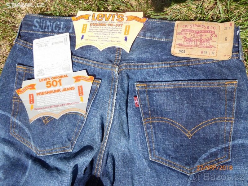 Prodám modré pánské nenošené jeansy - viz foto. Velikost: šířka pasu cca 2 x 43 cm W33 (palce v USA - inch) tj. 25,4 mm Obvod v pase cca 85-86 cm (ze zkušenosti po vyprání se trochu vytáhnou) vnitřní délka nohavice: cca 79cm, vnější délka nohavice: cca 107cm Šířka v sedu a u nohavic jeansová běžná klasika. Obě nohavice s krásným kytarovým vzorem - vhodné pro "bigbíťáka" - hráče na kytaru !! Lze poslat poštou tj. + poštovné. vážnému zájemci pošlu lepší foto celých kalhot s kytarovým motivem. Cena nákup 1490 Kč. Nabídka za 1100 Kč při rychlém jednání sleva na 990 Kč !!!