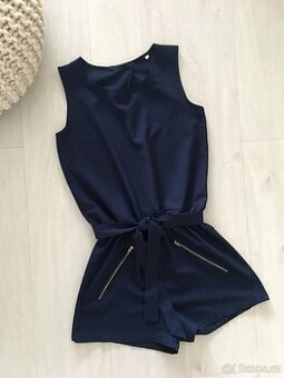 Nový. Záda jsou rozstřihlá, v pase pásek, zlaté zipy. Délka 74 cm, pas na gumu 27 - 45 cm. Barva: tm. modrá. Doprava dle tarifu.
