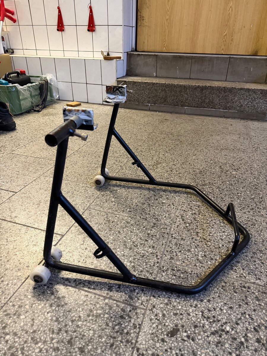 Prodám poctivě vyrobený zadní stojan na motorku, šíře se dá nastavit, výška 37cm. Bohatě postačí pro běžnou údržbu. Osobní odběr Turnov