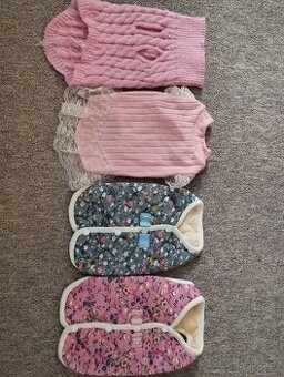 Rozměry ve fotkách. 1. Modrý květovaný obleček/ bundička s kožíškem 2. Růžová květovaná bunda s kožíškem 3. Svetřík s krajkou - velice elastický 4. Růžový svetr - velice elastický Možnost poslat penguin boxem za 59kc či zasilkovnou, balíkovnou nebo českou poštou v obálce