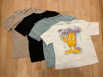 Hezká chlapecká trička s krátkým rukávem. Běžné známky nošení. Určitě ještě poslouží. Tričko s Garfieldem má na zádech flíčky (dávám zdarma k ostatním). Velikost 146/152. Délka 56cm, šířka pod průramky 44cm. Cena celkem