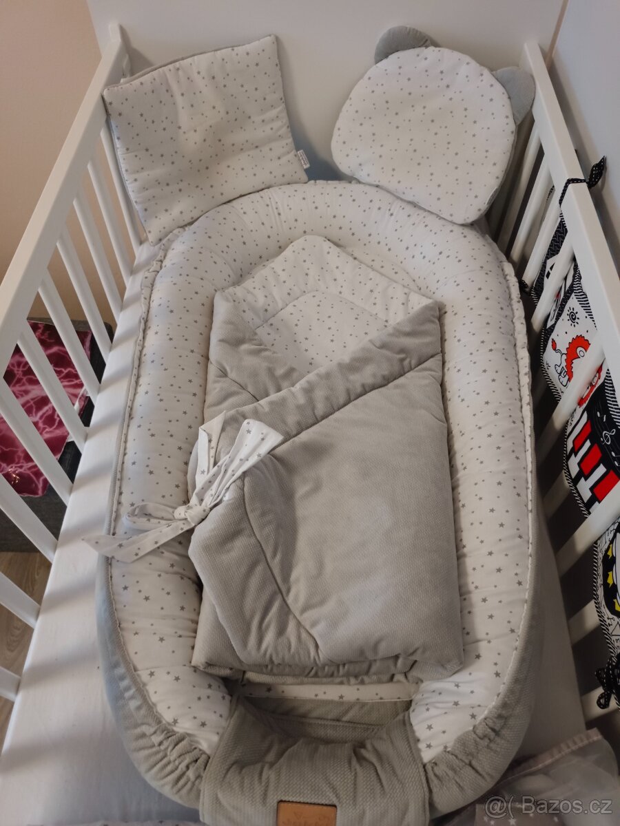 Prodám 6 měsíců používanou sadu do postýlky. Sada obsahuje: velké hnízdečko, které jde případně rozvázat, dva oboustranné polštářky,dečku, podložku, prostěradlo, zavinovačku a nebesa.